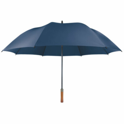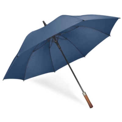 Paraguas con pulsador y mango de madera, además su tela es impermeable. Disponible en colores marino, negro y piedra.