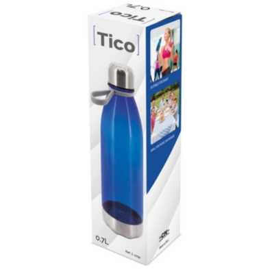 La botella “TICO” combina calidad, resistencia y diseño gracias a la ligereza de su cuerpo fabricado en Tritán, y la elegancia de sus terminaciones en Acero Inoxidable. Además de la practicidad que ofrece su tirador fabricado en silicona. Capacidad 700 ml. Incluye caja. Disponible en acabado Transparente, Gris y Royal. ¿Qué es el tritan? Es un polímero de gran dureza y resistente a la vez muy ligero y libre de BPA (componente químico que llevan algunos plásticos que en determinadas condiciones, migra a los alimentos o bebidas).