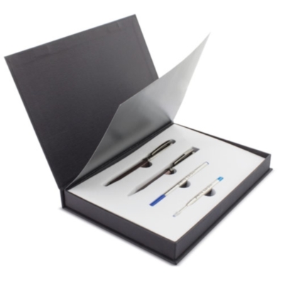 Descubre la elegancia y distinción que caracterizan a la marca Pierre Cardin en este exclusivo estuche homenaje inspirado en un libro compuesto por 4 piezas. Al abrirlo, descubrimos en la primera hoja una cita junto a la imagen de Pierre Cardin. En su interior encontramos un bolígrafo, un roller y recambios de tinta para ambos. El bolígrafo, con sistema de giro y el roller presentan un diseño facetado en color granate en el cuerpo, y un acabado metálico en color plomo en los apliques y la tapa. Escritura Azul.