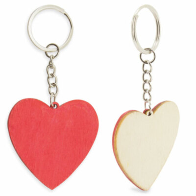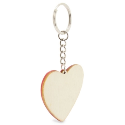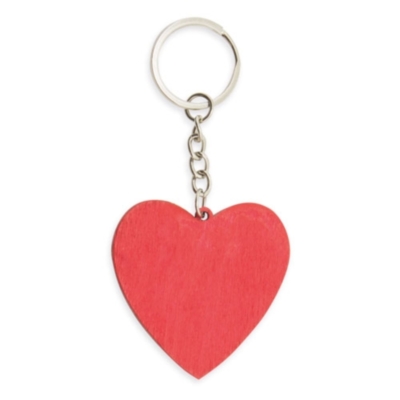 Original llavero realizado en madera natural, con forma de corazón presentado en dos tonalidades diferentes: madera en una de sus caras y de color rojo en la otra cara.