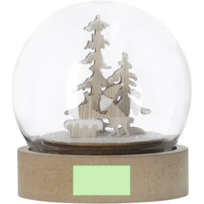 Bola iluminada con original diseño navideño. Elaborada en resistente material acrílico, con base de madera lisa para impresión. Dispone de iluminación interior con 1 LED en tono blanco. Alimentación por 3 pilas de botón, incluidas, con botón ON/OFF en la base. Elaborado con elementos vegetales para así fomentar la utilización de materias primas naturales y reducir las emisiones contaminantes.