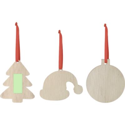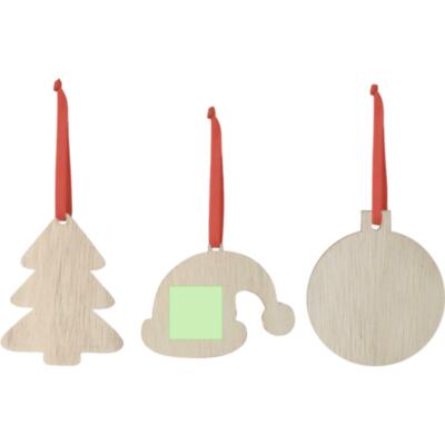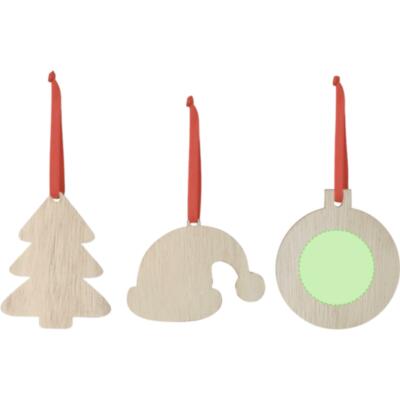 Adorno navideño fabricado en suave madera natural. Disponible en varios diseños: Gorro de Papá Noel, Árbol de Navidad y Bola de Navidad. Incluye lazo colgador en color rojo. Especialmente diseñado para marcaje en sublimación.Elaborado con elementos vegetales para fomentar así la utilización de materias primas naturales y reducir las emisiones contaminantes.