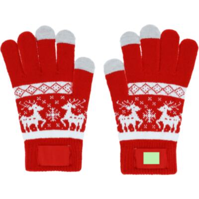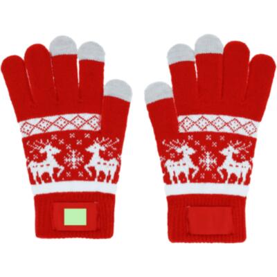 Cálidos guantes con motivos navideños. Función táctil en dedos corazón, índice y pulgar, fabricados en suave acrílico. Con etiqueta especial para el marcaje. Un original regalo para lucir con estilo en navidad.