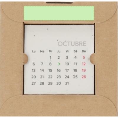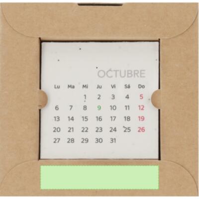 Calendario plantable fabricado en papel de semilla. Incluye 13 hojas con semillas de petunia de colores surtidos, convirtiéndolo en papel plantable después de su vida útil. Diseño de mes en curso, con festividades nacionales marcadas en rojo y autonómicas en verde. Presentado en caja soporte de cartón.