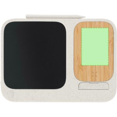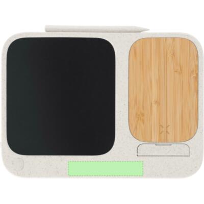 Cargador inalámbrico de 15W con pizarra digital integrada, fabricado en caña de trigo y bambú. Con función de soporte para smartphone compatible con dispositivos equipados con tecnología de carga inalámbrica Qi e indicador de estado de carga. Cuenta con pizarra tablet LCD de 6 pulgadas e incluye lápiz , botón de borrado y bloqueo anti borrado. Materiales como el bambú fomentan la utilización de materias primas naturales reduciendo las emisiones contaminantes. Además, el bambú proviene de una planta de gran resistencia y versatilidad, con crecimiento y regeneración rápida, siendo una excelente alternativa al uso de madera tradicional.La caña de trigo fomenta la utilización de materias primas naturales, reduciendo así las emisiones contaminantes.Fabricado conforme a los estándares RoHS y en cumplimiento con los siguientes requisitos de seguridad:Sistema de protección contra sobrecalentamiento. Sistema de protección contra sobrecarga. Sistema de bloqueo para evitar cortocircuitos.