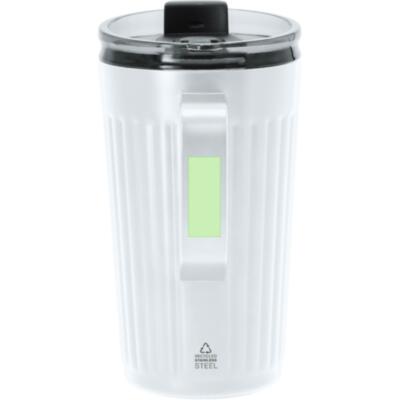 Taza térmica fabricada en Acero Inox Reciclado de doble pared y 350 ml de capacidad. Exterior en acabado biselado en color metálico mate. Incluye tapadera con sistema de cierre a presión transparente con orificio especial para pajitas, tapón de silicona y dosificador de fácil apertura abatible, libre de BPA. Base antideslizante de silicona y distintivo de Acero Inox Reciclado. El acero es uno de los materiales más demandados y que puede encontrarse casi en todas partes, desde productos de uso diario a grandes construcciones. Con innumerables propiedades, entre las que cabe destacar la durabilidad y su alto grado de reutilización, convirtiéndolo en una alternativa muy valorada en soluciones de sostenibilidad. Debidamente tratado, permite obtener nuevos recursos de infinita utilización.