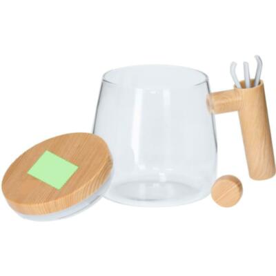 Taza mezcladora fabricada en resistente cristal de borosilicato de 400ml de capacidad. Incluye tapadera con agitador eléctrico alimentado por 2 pilas AAA (no incluidas) y botón de on/off en la parte superior. Con compartimento en mango especial para guardar el agitador, fabricados en ABS imitación madera. Además, tiene escala de medidas impresa en el cuerpo de color blanco.Fabricado en cristal de borosilicato, que ofrece una resistencia y durabilidad excepcionales, alargando su vida útil y pudiendo ser reutilizado infinidad de veces.