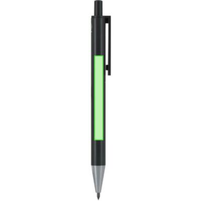 Set compuesto por un bolígrafo de tinta azul y un lápiz eterno, fabricados en Aluminio Reciclado. El lápiz eterno ofrece escritura continua, evitando generar residuos. Ambos cuentan con mecanismo pulsador. Diseñados con clip a juego y detalles cromados. Presentados en estuche de cartón reciclado de color negro. Con distintivo de AL Recycled impreso.