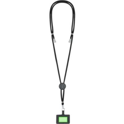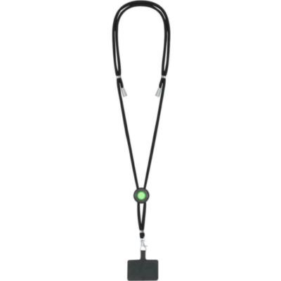 Lanyard con accesorio para smartphone. Fabricado en resistente poliéster. Accesorio de transporte para situar entre la funda y el smartphone y mosquetón giratorio metálico. Ajustadores en cuello, con detalles cromados en los extremos de los cordones de ajuste.