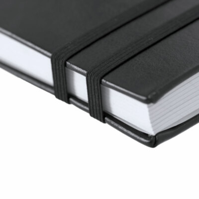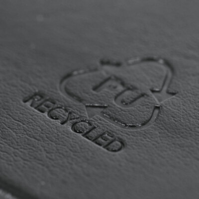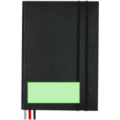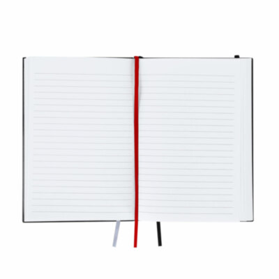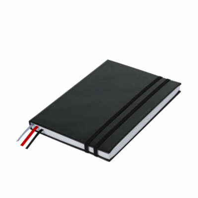 Bloc de notas en tamaño A5 con cubiertas rígidas y suaves, elaborado en PU reciclada y RPET. Marcapáginas en cinta en tres colores diferentes (negro, rojo y gris) para fácil planificación del día a día y doble cinta elástica de cierre a juego. Incluye 128 hojas color blanco con disposición a rayas y un práctico bolsillo de papel para notas sueltas. Ideal para llevar un diario y mantener la planificación durante todo el año. Con distintivo de PU Reciclado.La PU Reciclado destaca por su resistencia y elasticidad. Este material reciclado y reciclable es una opción sostenible que rescata las fibras desechadas en los procesos de fabricación, minimizando así el desperdicio de material y contribuyendo a su vez a reducir el impacto ambiental, manteniendo a la vez sus propiedades originales.