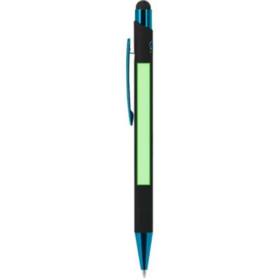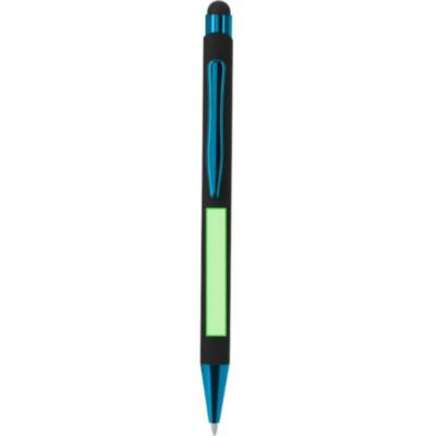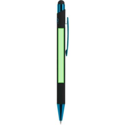 Bolígrafo puntero de mecanismo pulsador fabricado en aluminio reciclado. Pulsador, clip metálico y punta en acabado brillante. Cuerpo terminación en goma, especialmente diseñado para marcaje en láser con efecto espejo. Distintivo aluminio reciclado en la parte superior del bolígrafo. De carga jumbo y en tinta azul.