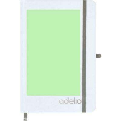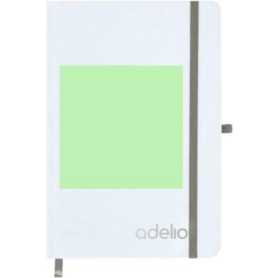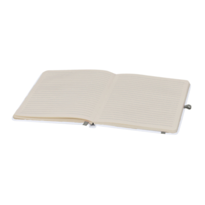 Bloc de notas con tapas rígidas blancas fabricadas en Cartón Reciclado. Interior con 80 hojas a disposición de una raya. Incluye marcapáginas, en mismo color que cinta elástica de cierre y portabolígrafos. Especial para grabado láser mostrando el color seleccionado.