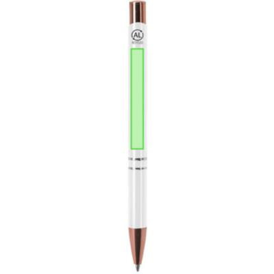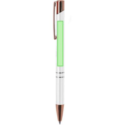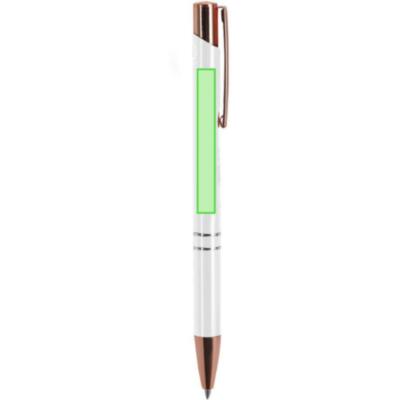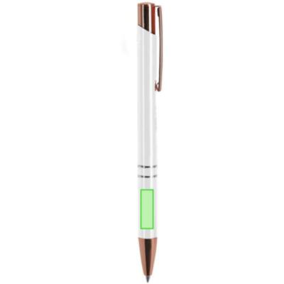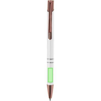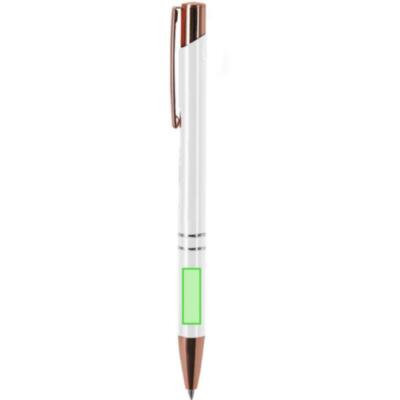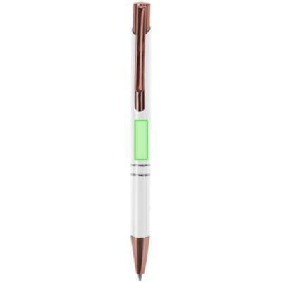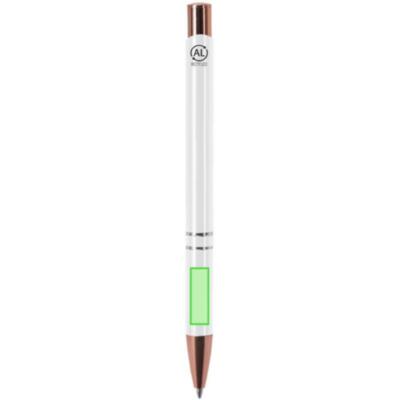 Bolígrafo de mecanismo pulsador fabricado en aluminio reciclado. Incluye accesorios plateados y clip, pulsador y punta en acabado rose gold. Tinta azul. Distintivo aluminio reciclado en la parte superior del bolígrafo.