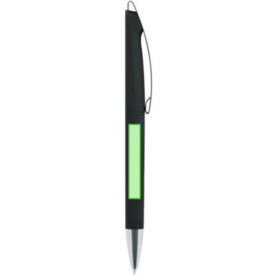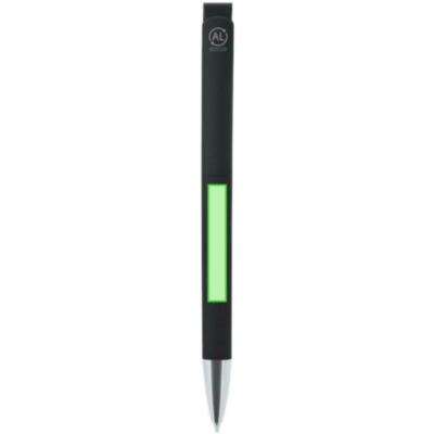 Bolígrafo de mecanismo pulsador. Punta en acabado metalizado. Cuerpo terminación en goma,clip especialmente diseñado para marcaje en láser con efecto espejo. En tinta azul.