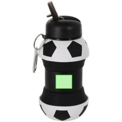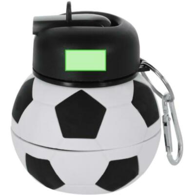 Bidón plegable con diseño de balón de futbol con capacidad de 550 ml. Incluye anilla metálica con mosquetón para práctico transporte. Tapa de rosca con boquilla. Libre de BPA.