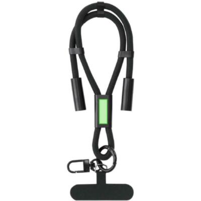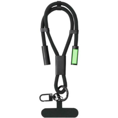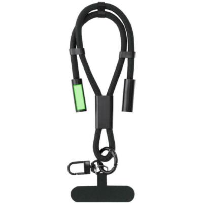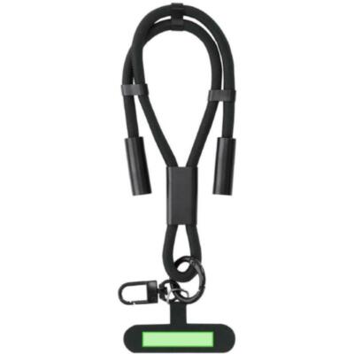 Pulsera con función de soporte y cable cargador, fabricado en una combinación de poliéster RPET. Diseñado para colocarse fácilmente entre la funda y el smartphone gracias a su accesorio de transporte. Incluye cinta a juego, mosquetón metálico giratorio en color negro y accesorio para ajuste en muñeca. Ofrece funcionalidad de carga y traspaso de datos, con entrada Tipo C 60W, y salidas Tipo C.