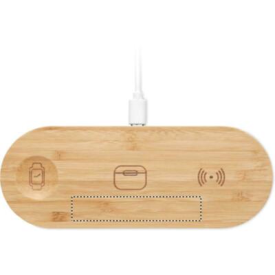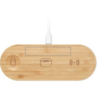 Base de carga 3 en 1 en estuche de bambú. Incluye un cargador inalámbrico de 15 W, un cargador para smartwatch (solo Apple®) y un cargador TWS.