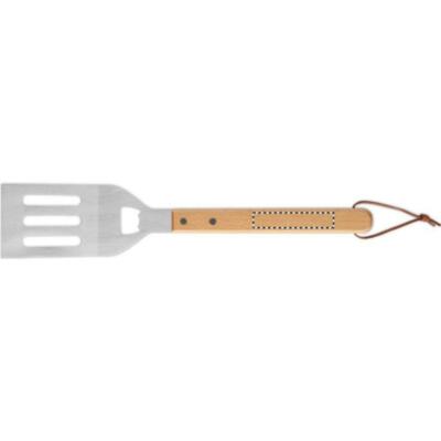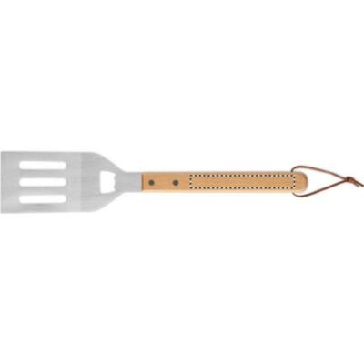 Espátula para barbacoa de acero inoxidable con mango de madera de haya y abrebotellas integrado. Incluye colgador de cuerda de PU para guardarla fácilmente.