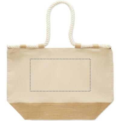 Bolsa de playa de lona de algodón de 280 gr/m² y yute con asas de cuerda. Con cierre de cremallera, base recubierta de yute y 10 trabillas de yute.