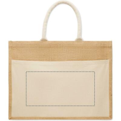 Bolsa de la compra de yute laminado y lona de algodón de 280 gr/m² con asas de cordón. Incluye gran bolsillo frontal abierto.