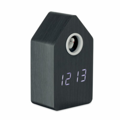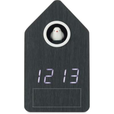 Reloj de cuco de MDF con alarma incorporada / indicador de temperatura. El pájaro sale cada hora y tiene voz de pájaro cuco. Pantalla LED blanca. El sonido se silencia automáticamente entre las 22.00h y las 06.00h. intervalos de repetición de 5 minutos.