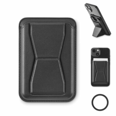 Tarjetero para teléfono de piel de PU con función de soporte y cierre magnético. Compatible con iPhone® 12 y posteriores. Incluye anillo metálico magnético para admitir la carga de otros teléfonos con carga inalámbrica no magnética.
