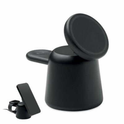 Base de carga 3 en 1 en ABS. Incluye cargador inalámbrico magnético de 15 W para teléfono y TWS con función de soporte para teléfono y cargador para smartwatch (solo iOS). Función magnética compatible con iPhone® 12 y posteriores.