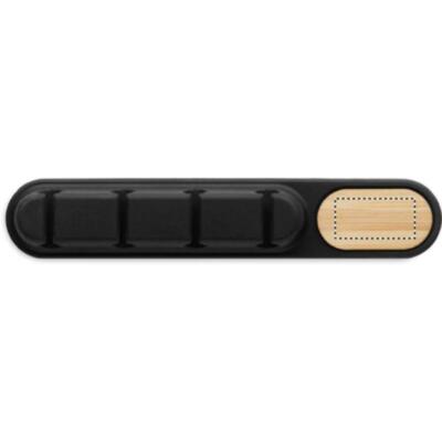 Organizador de cables de silicona con detalle de bambú natural. Su diseño ovalado y compacto mantiene los cables ordenados y seguros.