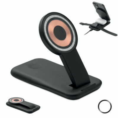 Base de carga 3 en 1 en ABS. Incluye un cargador inalámbrico magnético de 15 W con función de soporte para teléfono , cargador TWS y cargador para smartwatch (solo Apple®). Compatible con iPhone® 12 y posteriores.