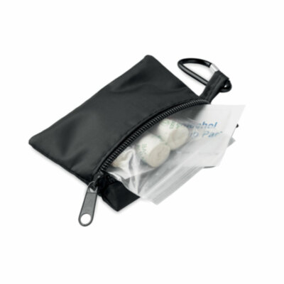 Botiquín compacto en bolsa de RPET con mosquetón de aluminio. Incluye 4 torundas con alcohol, 3 tiritas, 2 vendas, 2 gasas, 1 esparadrapo y 1 tijera. No disponible para la venta fuera de la UE.