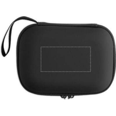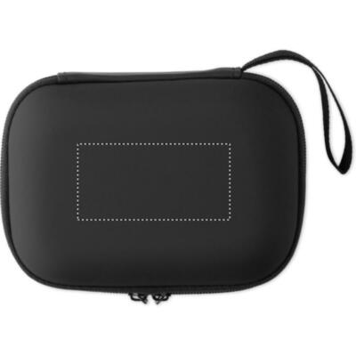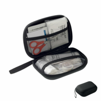Botiquín primeros auxilios en estuche rígido de PU. Incluye 2 guantes, 1 manta, 1 esparadrapo, 2 vendas, 1 tijera, 4 bastoncillos, 10 tiritas y 6 toallitas. No disponible para la venta fuera de la UE.