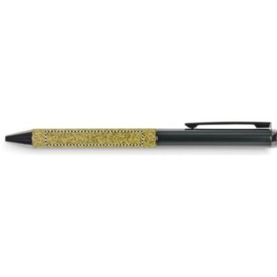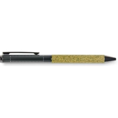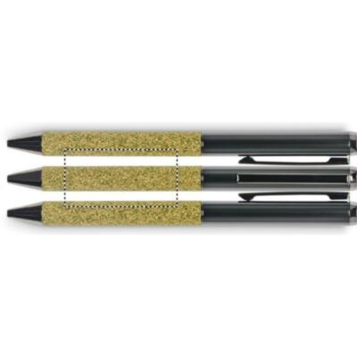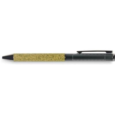 Bolígrafo de metal giratorio con cuerpo de tela fabricado con un 20% de posos de té, un 30% de corcho y un 50% de tela de poli algodón en caja de cartón. Tinta azul.