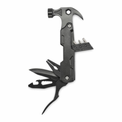 Martillo multiherramienta 14 en 1 de acero inoxidable con mango de aluminio. Incluye alicates, destornilladores, llaves inglesas, cuchillo, sierra, cortaalambres y abrebotellas.