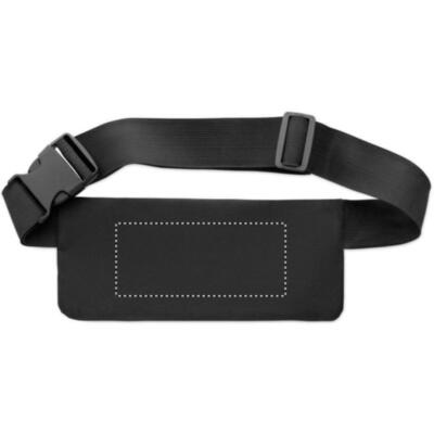 Riñonera de running fabricada en poliéster RPET 600D con refuerzo de PU. Compartimento principal con cremallera, bolsillo lateral con cremallera y correa elástica ajustable. Ligera y duradera.