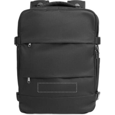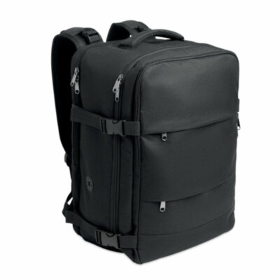 Mochila expandible tamaño cabina en poliéster RPET 600D, refuerzo de PU y apertura 180º. Con división para calzado, bolsillo acolchado para portátil 15', correa para trolley y hebillas laterales.