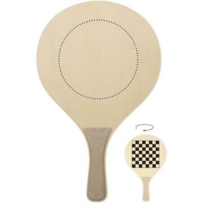 Set de playa con 2 palas de madera con tableros de ajedrez y parchís. Incluye 1 pelota de TPR, dados y fichas. Viene en bolsa de malla RPET con cremallera. Madera contrachapada.