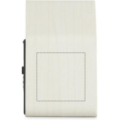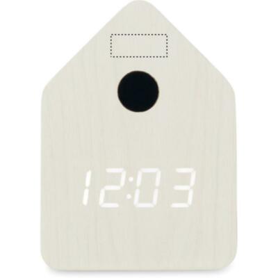Pequeño reloj de sobremesa de MDF que incluye una alarma integrada con voz de pájaro cuco y visualización de la temperatura. Pantalla LED blanca. El sonido se silencia automáticamente entre las 22.00h y las 06.00h. intervalos de repetición de 5 minutos