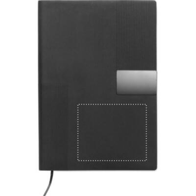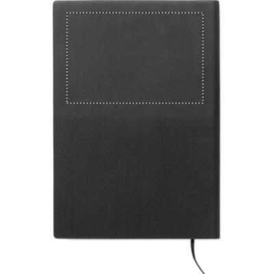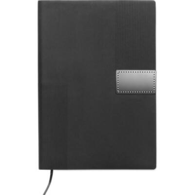 Libreta A5 con cubierta de soft PU. 160 páginas de papel reciclado rayado (80 hojas). Banda elástica y cinta marcapáginas a juego. Detalle de hierro metálico en la parte delantera.