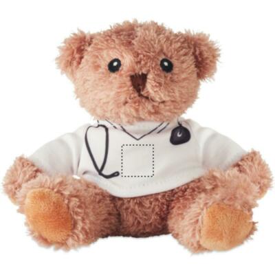 Osito de peluche de poliéster vestido de médico con camiseta blanca estampada. Ojos, nariz y boca bordados.