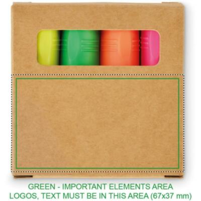 Set de 4 rotuladores fluorescentes en caja kraft.