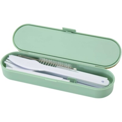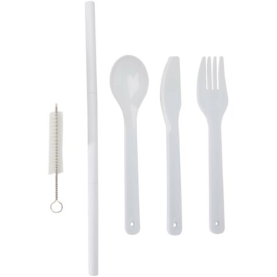 Juego de cubiertos reutilizables que incluye tenedor, cuchillo, cuchara, pajita y limpiador de pajitas. Es ideal para comidas fuera de casa. Compacto y fácil de limpiar, es perfecto para llevar con la fiambrera, viajar o en la oficina. Se presenta en una caja de plástico con tapa de bambú.