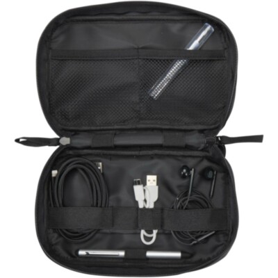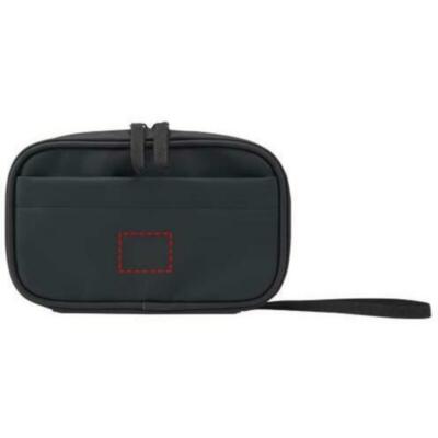 Fabricada en piel de poliuretano reciclada con certificación GRS y un forro de RPET a juego, esta bolsa tecnológica está diseñada para viajeros, trabajadores remotos y entusiastas de la tecnología. Compacta y fácil de llevar en una mochila o bolsa de cabina, tiene un compartimento principal con cremallera con prácticas funciones de organización, como un sujetabolígrafo elástico, dos bolsillos de malla para auriculares y pequeños accesorios, un separador reforzado y múltiples correas elásticas para sujetar con seguridad cables, memorias USB y cargadores. El exterior incluye un bolsillo frontal con cierre de gancho y bucle para un acceso rápido, junto con un asa de cincha para mayor comodidad. Acabada con un revestimiento resistente al agua, mantiene tus objetos personales protegidos vayas donde vayas. Capacidad: 1 litros.