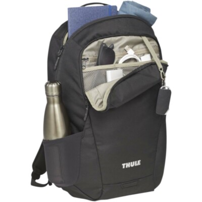 La mochila para portátil de 16" "Thule Lumion" está fabricada en poliéster reciclado y cuenta con un bolsillo frontal con cremallera para organización, así como un compartimento más grande con cremallera y funda para portátil acolchada de 16". El asa de transporte superior permite cogerlo y llevárselo, mientras que el panel acolchado del respaldo proporciona apoyo lumbar inferior. Esta mochila cuenta con un bolsillo lateral para botella de agua y correas con cadena.