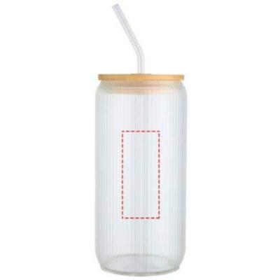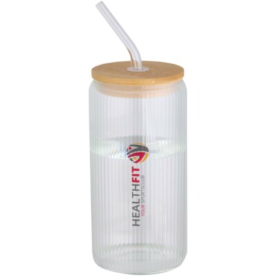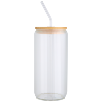 Jarra de vidrio borosilicato con pajita de vidrio y tapa de bambú. La jarra tiene un exclusivo diseño estriado en el interior y un exterior liso, ideal para imprimir un logotipo. El bambú utilizado se obtiene de forma sostenible, respetando la responsabilidad medioambiental y social. Se entrega en una caja de regalo de cartón reciclado. Capacidad: 650 ml.