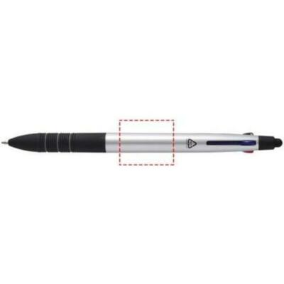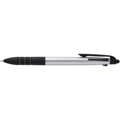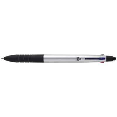 El bolígrafo 3 en 1 "Trine" es un instrumento de escritura versátil fabricado en plástico ABS con certificado RCS. Tiene un moderno acabado metálico y una punta stylus integrada para usar en pantallas táctiles. Dispone de un mecanismo deslizante para cambiar fácilmente entre tinta negra, azul y roja. La empuñadura ergonómica con caucho negro antideslizante y detalles de anillas grises garantiza un manejo cómodo. Compacto, funcional e ideal para tu marca, el bolígrafo "Trine" es perfecto para tomar notas, presentaciones o interacciones digitales.