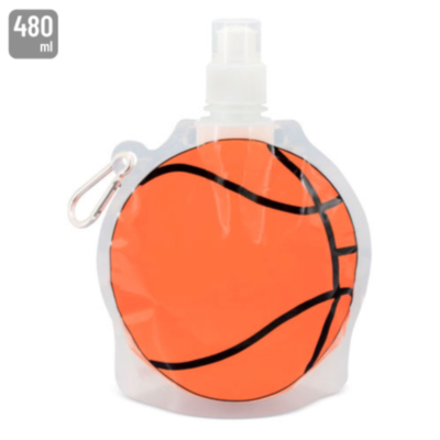 Práctico bidón plegable con mosquetón para colgar.Tiene una boquilla que incluye un tapón para mayor seguridad. Cómodo de rellenar, gracias a su tapa de rosca. Una vez vacío podrá transportarlo cómodamente en su mochila o bolsa de deporte ya que no ocupará apenas espacio. Su original diseño en forma de balón de baloncesto lo hace un producto divertido y práctico. Capacidad de 480 ml. Cada pieza en bolsa individual.