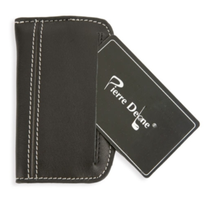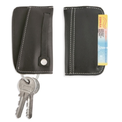 Tarjetero realizado en piel con cierre click para cinturón, interior con portallaves y presentación en estuche de cartón.