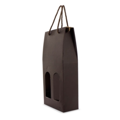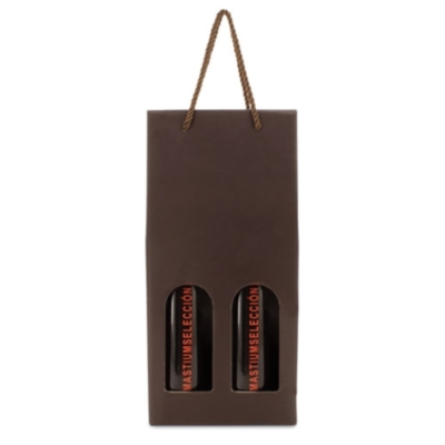 Lujoso y elegante estuche automontable con capacidad para dos botellas de vino realizado en cartón reforzado y cordón de suave textura.