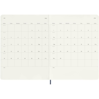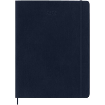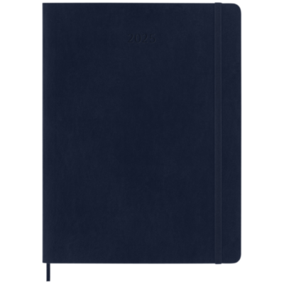 Dated from January to December 2025, the Moleskine soft cover 12-Month weekly XL planner shows the whole week at a glance, while also providing yearly and monthly snapshot pages for a broader overview of the year, followed by pages for travel planning, ideas and goals. The days of each week are shown on one side opposite a ruled page for tasks and notes. Features ivory-coloured acid-free paper, a black elastic closure, a page ribbon marker, a colour coordinated expandable inner pocket, and stickers for personal customisation, as well as year stickers for the spine.