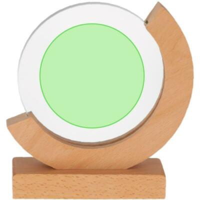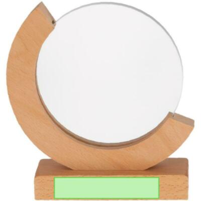 Placa trofeo de grueso cristal con elegante diseño circular con base en madera. Ideal para regalos personalizados, reconocimientos, premios y decoración. Presentada en estuche de protección individual en acabado Kraft.